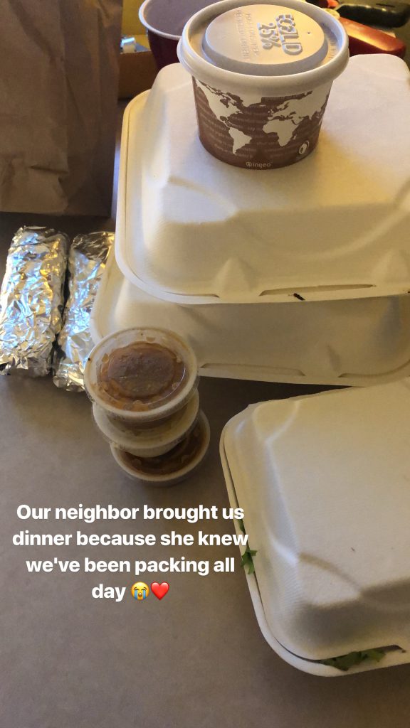 Today was another packing day. We ran into our neighbor, Betsy, on our way back up to the apartment with more boxes. She’s offered to help us in any way she can (she’s SO sweet), and tonight she showed up with dinner from the cafe on the corner. HOW AMAZING IS THAT?! She dropped it off and said she didn’t want us to have to worry about food on top of all the packing. I really hope we have neighbors this nice in GVL.